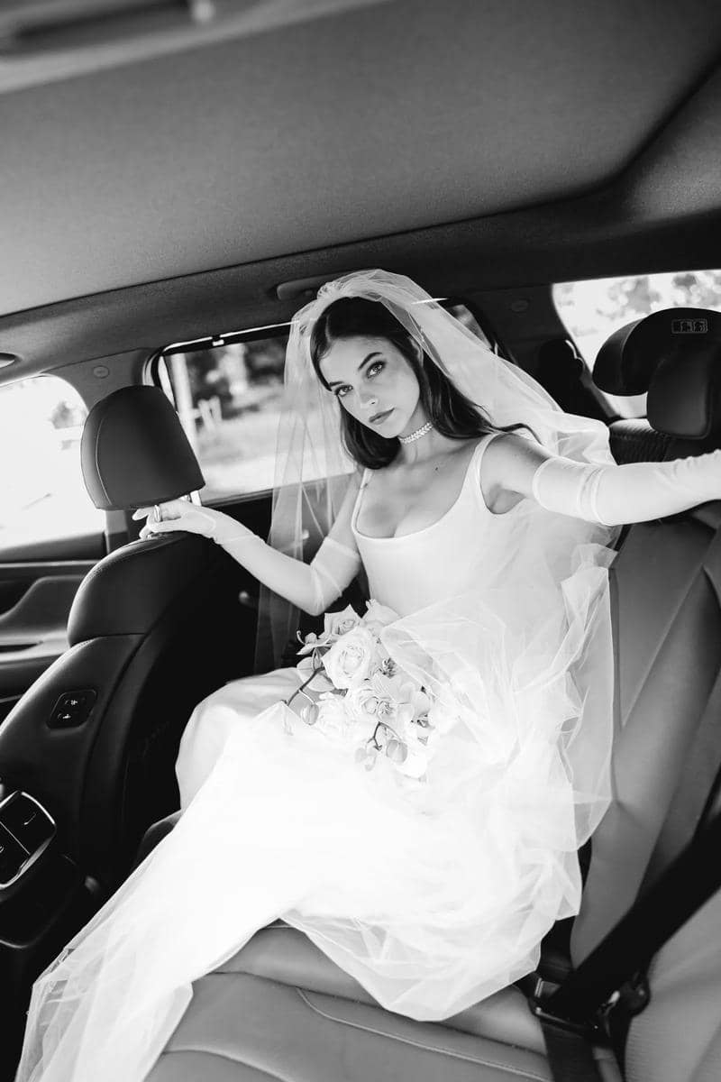 Barbara Palvin ingin sesuatu yang klasik dan timeless untuk upacara pernikahannya. Memilih gaun silk putih berdetail korset rancangan Vivienne Westwood, pesonanya tampak tak tertandingi. Gaun putih klasik tersebut dipadukan dengan veil dan pointed heels dari Jimmy Choo. Kalung diamond choker rancangan Tiffany & Co. yang terinspirasi gaya tahun 90-an melengkapi gaunnya dengan sempurna.