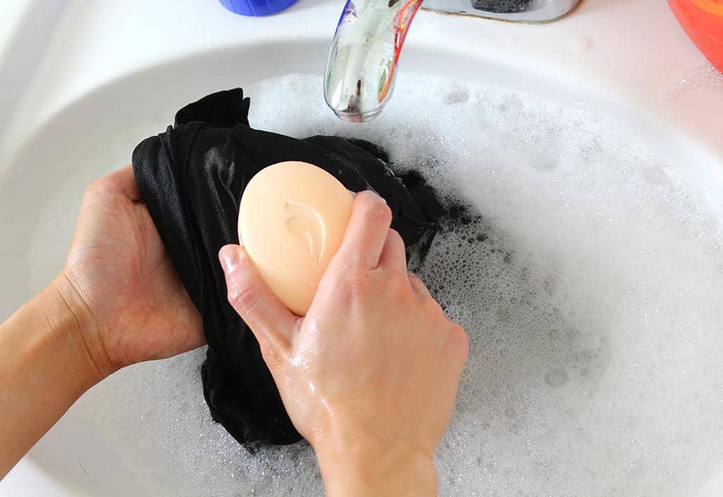 2. Cuci secara manual dengan tangan. Sikat di bagian tertentu yang terkena noda. Sikat juga bagian dalam untuk menghilangkan bau apek dan sisa keringat.