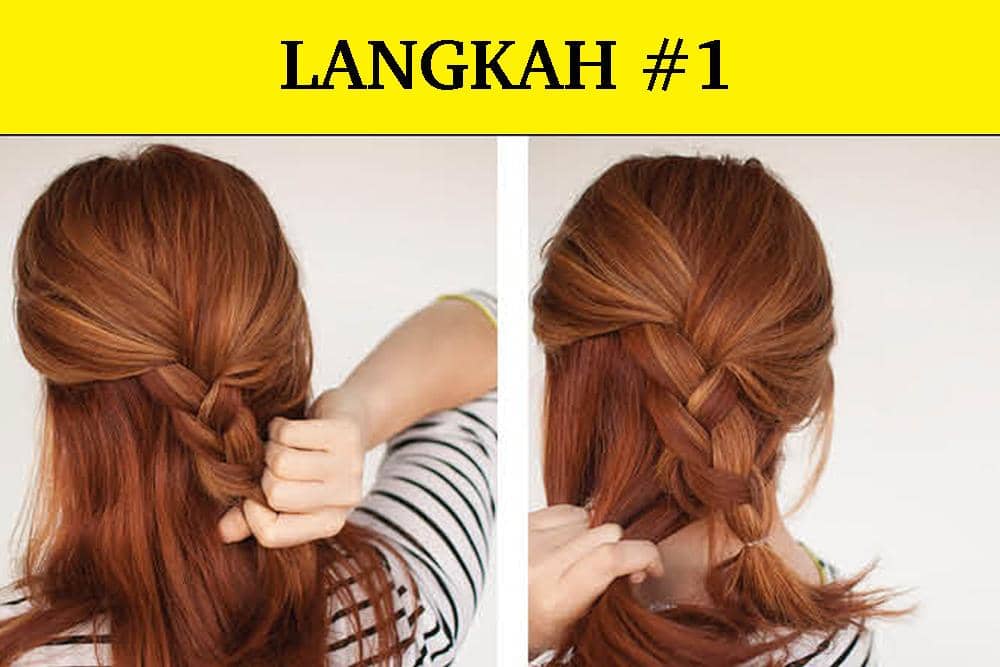 1. Pertama, bagi rambut kamu menjadi 2 bagian, atas dan bawah. Kemudian mulailah mengepang bagian rambut yang atas. Agar lebih aman ikat dengan karet rambut.