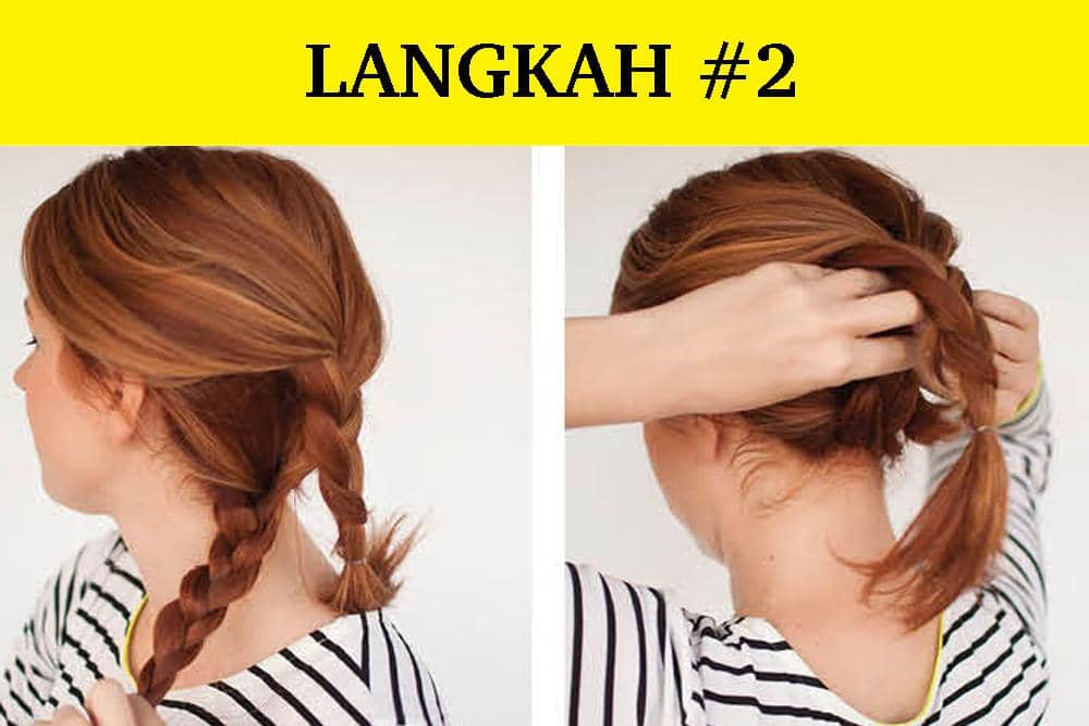 2. Selanjutnya mulailah kepang rambut bagian bawah dengan cara yang sama. Lalu mulai mulailah menggulung rambut bagian bawah yang sudah dikepang menjadi bun.