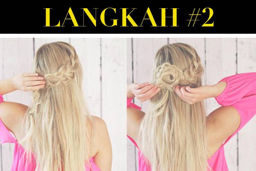 2. Berikutnya kamu bisa mengaitkan ke belakang seperti mau kuncir setengah, setelah itu gulung rambut kamu. Kencangkan dengan bobby pin atau jika kamu ingin rambutmu lebih tahan lama bisa menggunakan hair spray.