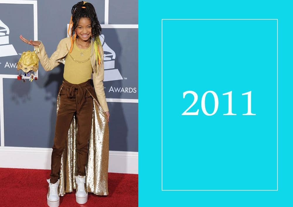Willow menghadiri acara penghargaan Grammy yang ke-53 dengan rambut corn row yang diikat bergaya ponytail dan outfit serba glittery bernuansa emas coklat serta platform sneakers berwarna putih.