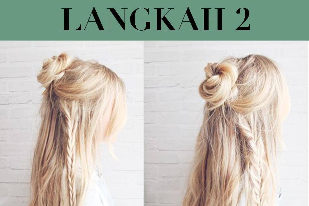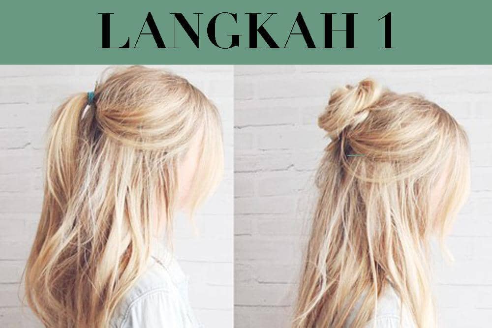 1. Pertama-tama kuncir rambutmu setengah, namun biarkan rambutmu menjuntai berantakan. Tarik semua rambutmu yang sudah dikuncir tadi membentuk simple bun, dan jepit dengan bobby pins.