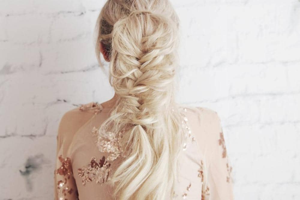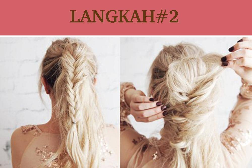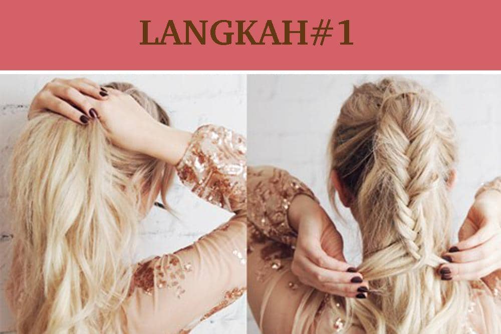 1. Hal pertama yang harus kamu lakukan adalah merapikan rambutmu, kemudian tarik semua rambutmu lalu ikat dengan karet rambut membentuk ponytail. Langkah berikutnya, mulailah kepang rambutmu dengan model fishtail braid.