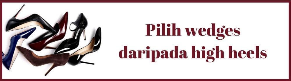 Jika memang harus menggunakan sepatu berhak tinggi, cobalah untuk memilih wedges daripada pump shoes atau stiletto. Wedges lebih mudah digunakan untuk berjalan dan memiliki tinggi yang lebih stabil.