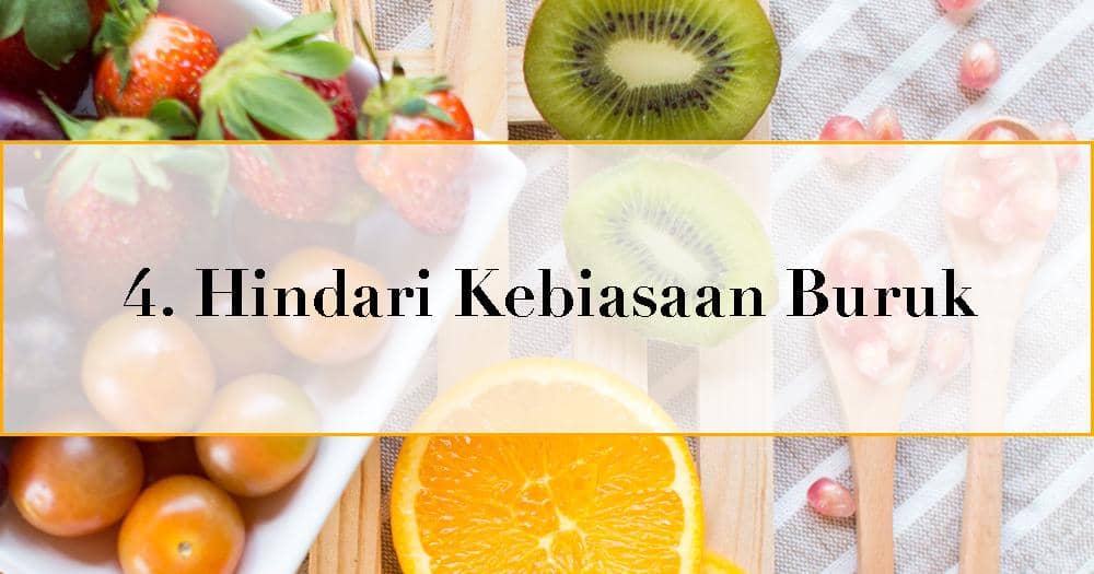 Selain mulai makan makanan sehat, kamu juga harus mulai menghindari kebiasaan buruk seperti merokok, minum alkohol, konsumsi makanan manis, berlemak dan bergadang.