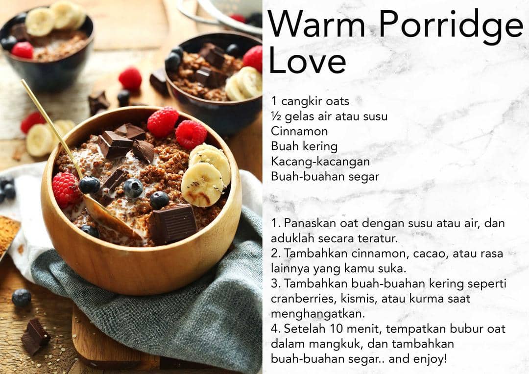 Makan sesuatu yang hangat saat sarapan sebenarnya sangat baik untuk pencernaanmu. Aku sangat menyukai bubur, karena oats memiliki tingkat karbohidrat yang rendah, sehingga dapat mencerna perlahan-lahan dan memberikan tubuhmu energi yang konstan. Saat kamu memakan roti putih, dengan langsung tubuh akan mencernanya, memberikan kamu sugar kick, namun cepat berlalu tanpa energi yang siginifikan dan meninggalkan rasa mengidam. Oleh sebab itu, karbohidrat yang perlahan lebih penting, Bela.