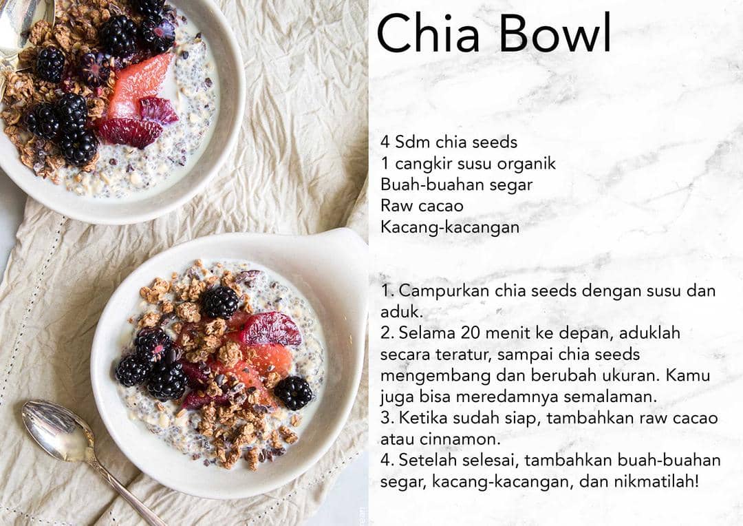 Chia seeds berasal dari Andes, di Amerika Selatan. Seeds ini memiliki kandungan Omega 3 fatty acids yang tinggi, sangat sehat dan diperlukan dalam diet kita sehari-hari. Omega 3 membantu menyembuhakan peradangan dalam tubuh, dan juga pada kulit. Oleh sebab itu, healthy fats sangat penting untuk kecantikanmu, Bela. Saat chia seeds dicampurkan dengan cairan, chia seeds kan mengembang. Chia seeds sangat baik untuk pencernaanmu, dan memberikan energi yang stabil. Yuk, kita membuat sarapan bersama dengan chia seeds.
