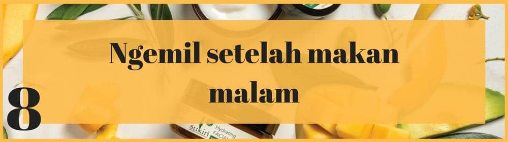 Meski kalorinya tidak seberapa, namun ngemil di malam hari bisa menambah energimu sehingga membuatmu tetap terjaga di malam hari. Kalaupun kamu mau ngemil, usahakan kalorinya di bawah 200 kalori.