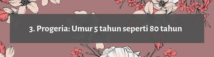 Normalnya, penuaan pada seseorang akan terlihat di usia paruh baya. Namun berbeda dengan seseorang yang mengidap Progeria atau bisa diartikan terjadi penuaan yang terlalu cepat. Penyakit ini akan membuat pengidapnya terlihat seperti nenek-nenek padahal masih anak-anak. Hal ini disebabkan oleh kecacatan genetik.
