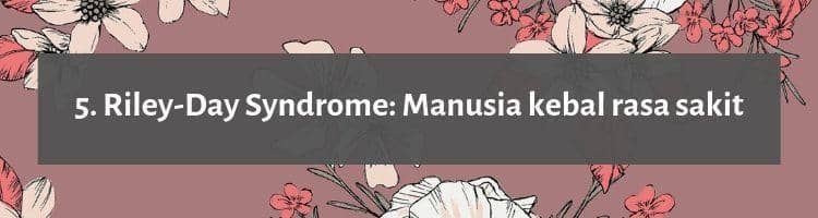 Kita pasti pernah melihat seseorang dengan kemampuan supranatural yang menyebabkan ia kebal terhadap benda tajam dan rasa sakit. Hal ini juga bisa terjadi pada seseorang tanpa kemampuan supranatural, melainkan karena mutasi genetik langka yang mempengaruhi sistem saraf otonom penghubung otak dan sumsum tulang belakang pada otot dan sel yang mendeteksi sentuhan, bau dan rasa sakit atau disebut juga dengan Riley-Day Syndrome. Sindrom ini bahkan bisa menyebabkan pengidapnya benar-benar kehilangan rasa sakit.