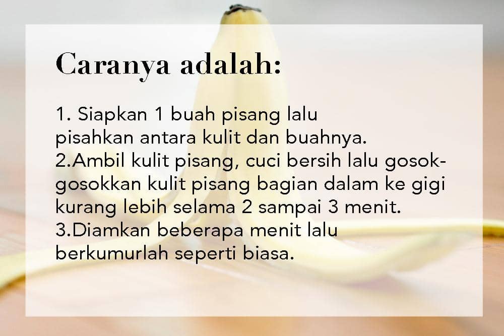 Menurut para ahli, kulit pisang dipercaya bisa mengangkat kotoran dan berbagai enamel pada gigi penyebab gigi kuning. Tak hanya itu saja, Bela nutrisi yang terkandung di dalam kulit pisang juga dipercaya bisa membuat gigi menjadi lebih kuat, sehat dan terhindar dari masalah gigi.