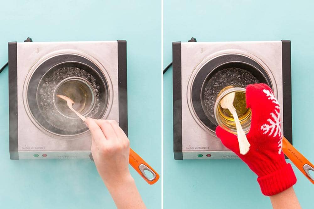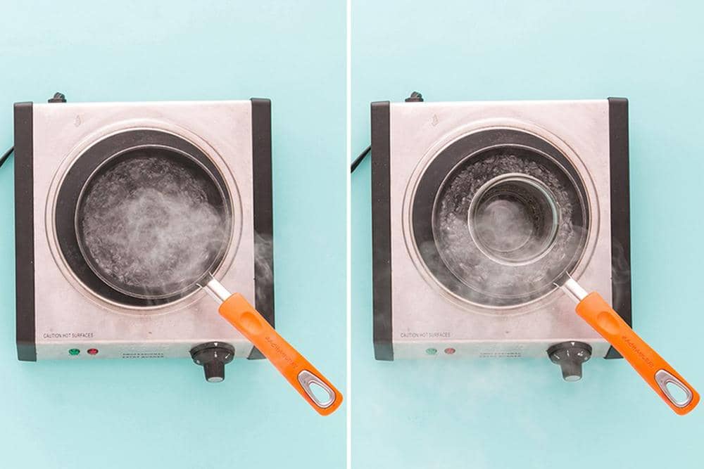 1. Siapkan toples, lalu letakan di atas panci yang telah berisikan air. Tunggu air tersebut hingga mendidih.