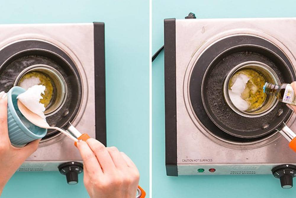 3. Setelah itu, masukkan minyak kelapa,minyak almond, dan teteskan peppermint oil lalu aduk hingga merata.