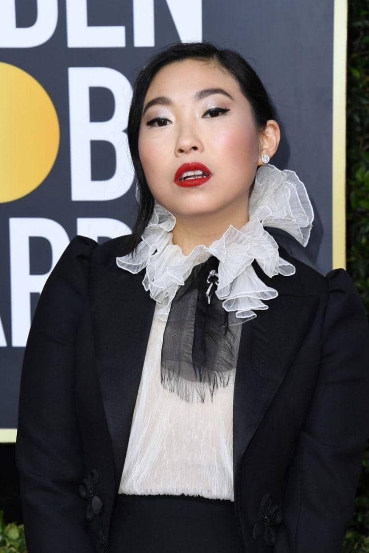 1. Kombinasi eyeshadow berwarna silver dan pulasan lipstik merah menyala sukses membuat penampilan Awkwafina jadi sorotan.
