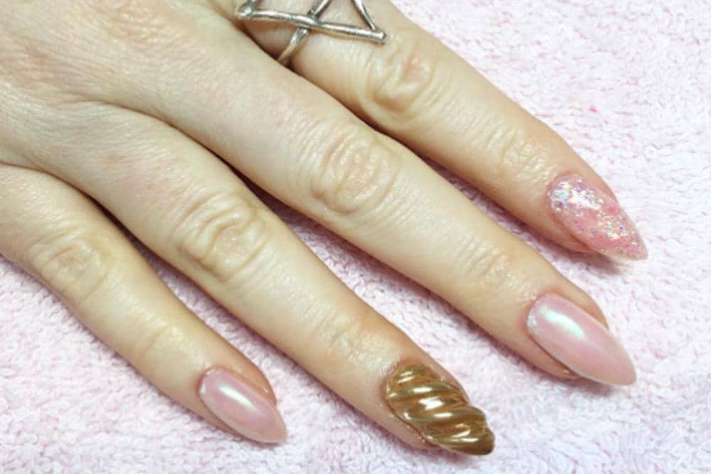 Warna pink hologram dengan detail glotter serta unicorn horn di jari keliking membuat nail art ini uber cute.
