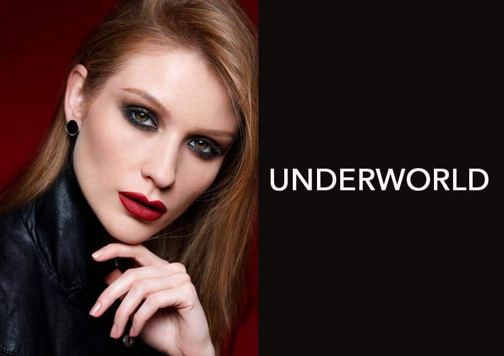 Tampilan ini menggambarkan karakter wanita yang kuat dengan riasan smudged smokey eyes dan pulasan lipstik berwarna merah gelap.
