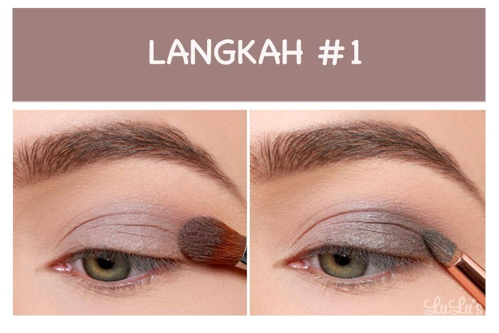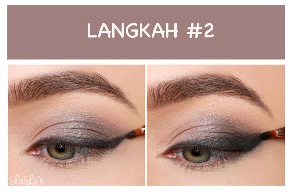 Pertama, pulaskan warna matte grey eye shadow, tipis-tipis dimulai dari bawah kelopak mata. Untuk mengaplikasikannya bisa menggunakan sigma brush E44. Kemudian gunakan pointed brush untuk mengaplikasikan shimmer charcoal dan pulaskan tepat di bagian luar kelopak mata.