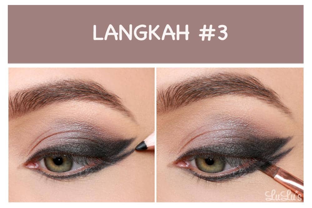 Selanjutnya, dengan hati-hati bentuklah wing out dengan eyeshadow hitam. Kamu bisa menggunakan brush agar lebih mudah. Lalu blend hitam eyeshadow tadi sampai ke bagian tengah kelopak matamu.