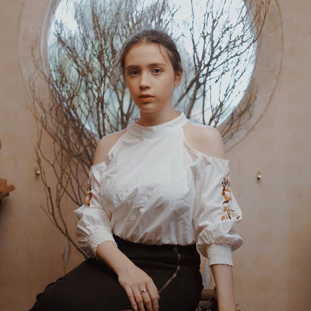 5. Meski menggunakan riasan yang sangat tipis, visual Sharon Sahertian tetap memikat. Wajah bulenya terlihat memikat.