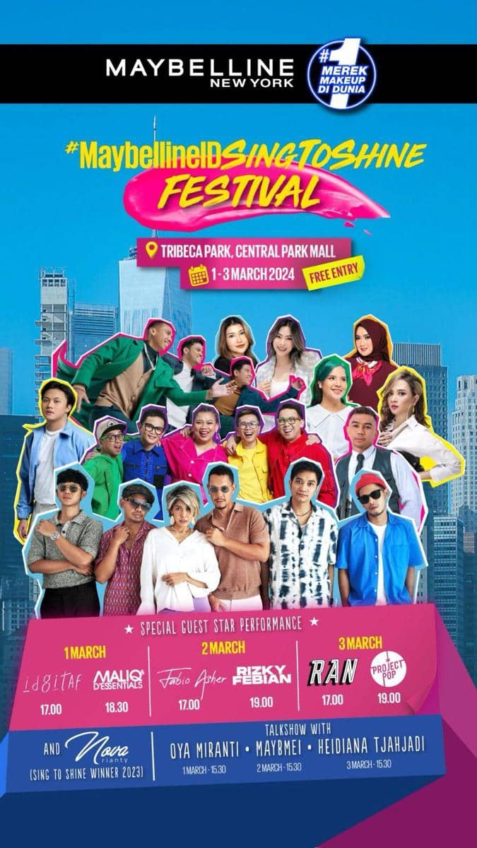 Tahun ini, Maybelline New York kembali membawa kemeriahan kota New York ke Jakarta. Dalam semangat menghidupkan karakter kota New York yang sarat dengan semangat ‘work hard, play hard’, brand makeup nomor #1 di dunia sekali lagi menggelar Maybelline Sing to Shine Festival – sebuah selebrasi musik dan makeup di Tribeca Park, Central Park Mall, dari 1-3 Maret 2024.