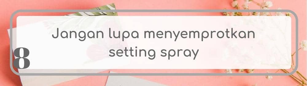 Salah satu kunci lain agar riasan pernikahan tahan lama sepanjang hari adalah dengan menguncinya menggunakan setting spray, Bela. Produk ini dapat menjaga makeup dari keringat dan air yang dapat menghapuskannya. Beberapa setting spray memiliki formula yang dapat menjaga sampai 16-18 jam! Jadi, pilih sesuai yang kamu butuhkan.