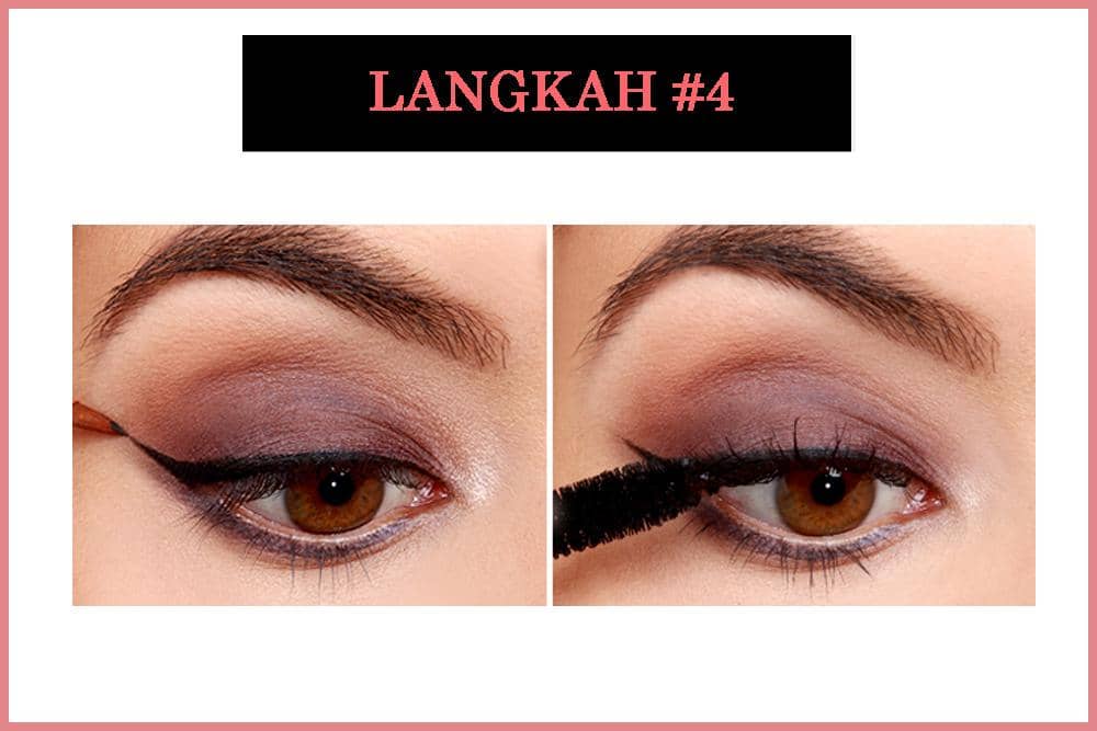 For finishing touch , dengan eyeliner cream warna hitam bentuk menjadi cat eye dan pulaskan maskara di bulu mata bagian atas dan bawah. Selesai deh Bela navy plum smokey eyes look.