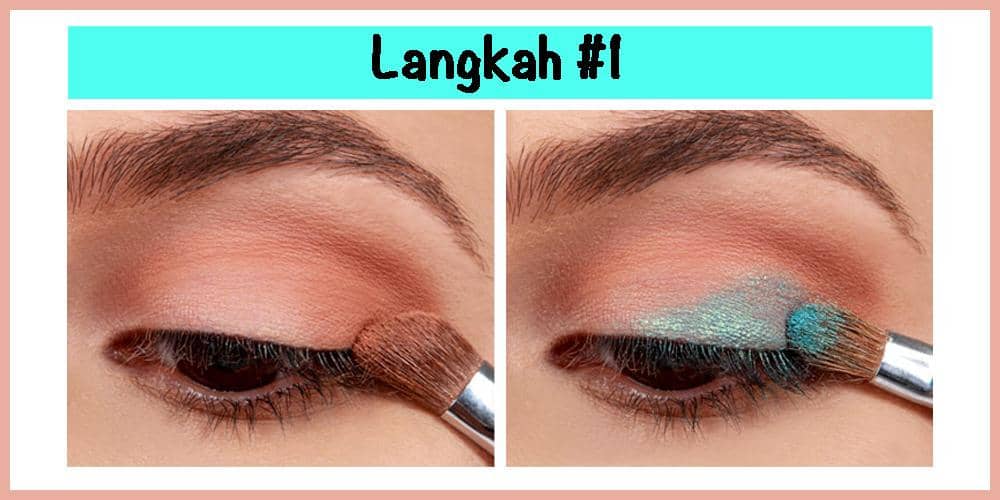 Pertama, pilih warna basic seperti warna matte nude colored eyeshadow, ini hanya untuk memberikan definsi saja di matamu. Lalu aplikasikan di kelopak kamu sampai bagian luarnya. Setelah itu pilih shimmery dengan warna turquoise eyeshadow, lalu aplikasikan hanya di bagian luar kelopak mata kamu ya.