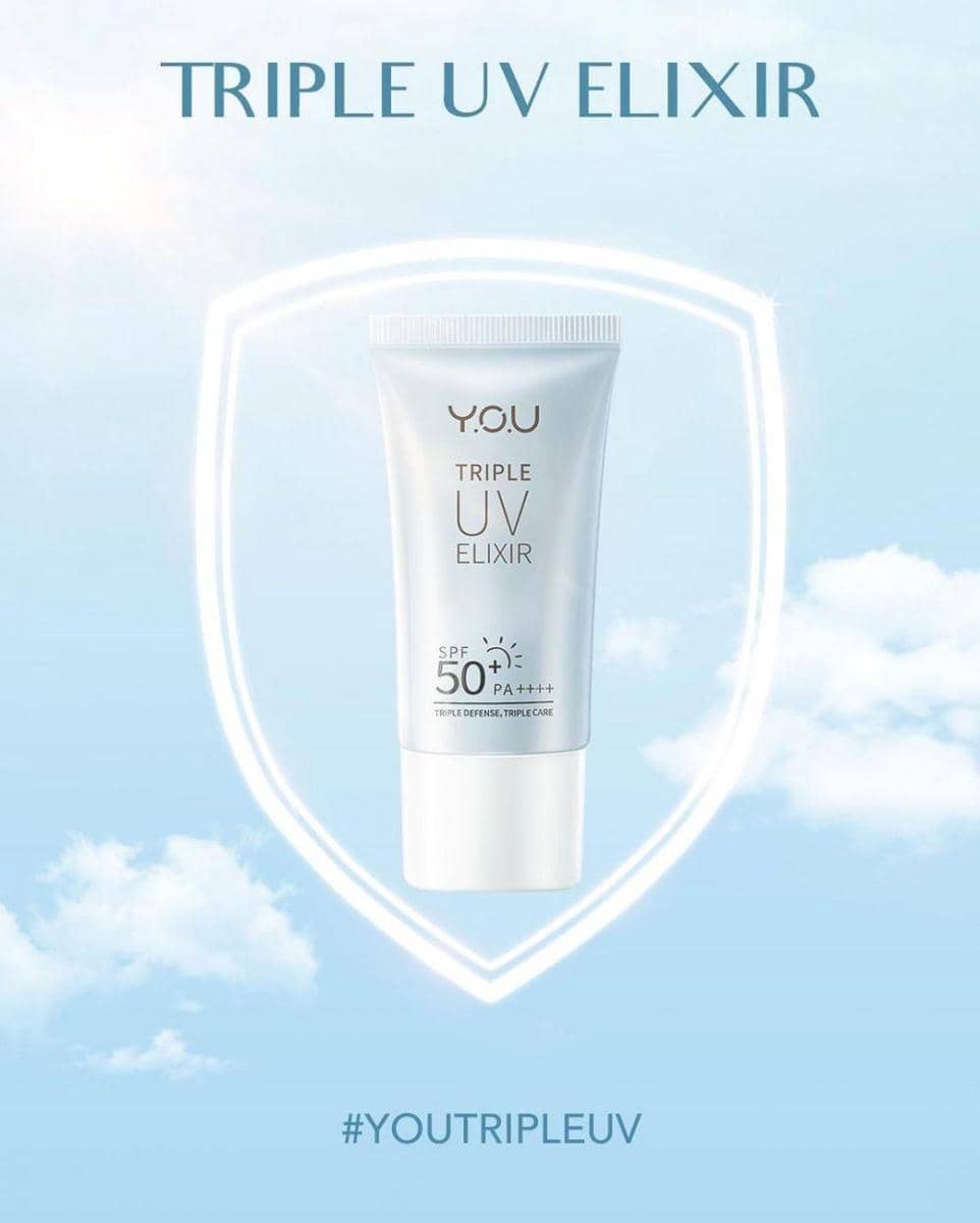 YOU Triple UV Elixir Sunscreen Gel ini memiliki tekstur yang ringan karena berbahan dasar air. Selain itu memberikan sensasi dingin sejuk ketika dipakai. Kandungan allantoin, vitamin E, niacinamide, dan centella asiatica mampu menutrisi kulit wajahmu. Kemasannya berupa tube warna silver dengan bagian tutup warna putih.