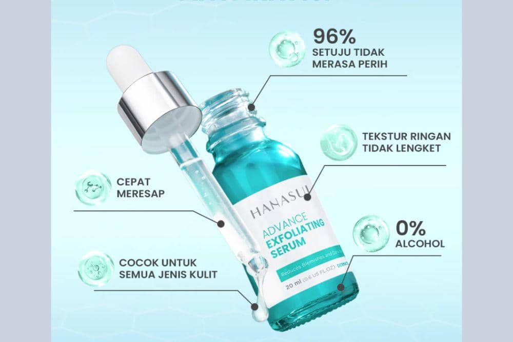 Kamu juga jangan lewatkan serum dari Hanasui. Serum eksfoliasi ini dilengkapi dengan kandungan AHA, BHA, dan PHA yang bisa mengangkat sel-sel kulit mati dan memperbaiki tekstur kulit. Mengandung tranexamic acid dan genowhite yang bantu mencerahkan dan menyamarkan noda hitam. Tidak mengandung alkohol, jadi aman digunakan semua jenis kulit.