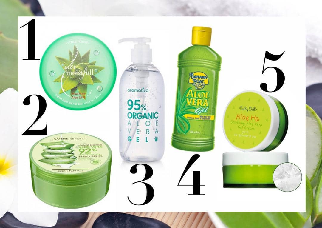 1. Aloe moistfull soothing gel, Etude House, IDR 86,000; 2. Aloe vera soothing gel, Nature Republic, IDR 55,400; 3. Organic aloe vera gel, IDR 122,200; 4. Aloe vera gel, Banana Boat, IDR 83,600; 5. Soothing aloe vera gel, Cathy Doll, IDR 223,500