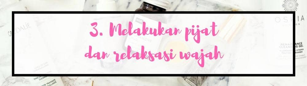 Kamu bisa juga mencontoh tren kecantikan dari perempuan Korea yang gemar melakukan pijat dan relaksasi wajah. Tujuannya adalah dapat melancarkan dan merangsang sirkulasi darah di bawah lapisan kulit luar. Hal ini sangatlah penting untuk membuat tampilan kulit tetap segar dan lembut. Gunakan essential atau face oil yangakan membuat wajahmu semkain mulus.