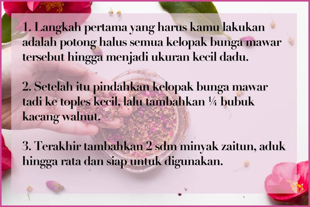 Tubuh yang mulus serta berkilau bisa kamu dapatkan dengan rutin melakukan perawatan baik dari dalam maupun dari luar. Salah satu cara yang dilakukan adalah rutin melakukan scrub atau eksfoliasi. Dilansir dari Allbeautifulmess, saat ini kamu nggak perlu repot pergi ke salon, karena kamu bisa melakukannya di rumah dengan membuat scrub alami dari kelopak bunga dan kacang walnut ini. Ingin tahu caranya seperti apa? Yuk lihat caranya di bawah ini
