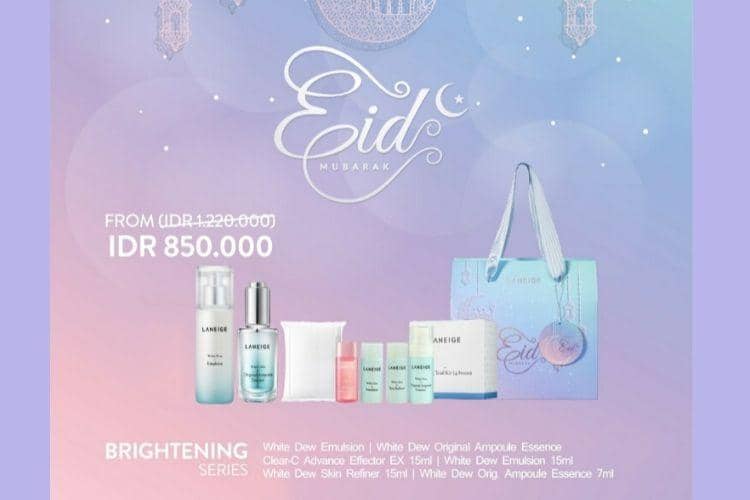Kulit yang terpapar sinar matahari di daerah tropis terlebih di saat bulan puasa dengan keterbatasan konsumsi air dapat menyebabkan kulit menjadi kusam. Paket Ramadhan Laneige Brightening Series dapat menjadi pilihan untuk solusi kulit kusam, yang terdiri dari White Dew Emulsion, White Dew Ampoule Essence, White Dew Cleanser, Clear C Trial Kit.