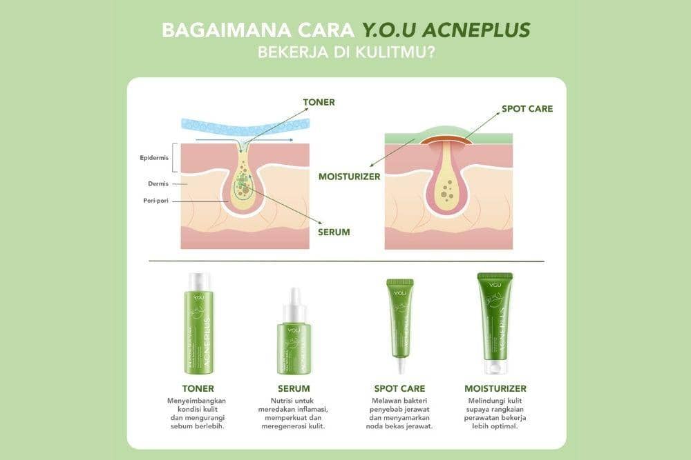 Y.O.U AcnePlus Series tidak mengandung alkohol, minyak mineral, wewangian, dan pewarna buatan sehingga aman untuk digunakan. Setelah melakukan tahap cuci muka, kamu bisa mengaplikasikan Y.O.U AcnePlus Balancing Skin Toner agar dapat menyegarkan kulitmu. Setelah itu, step terpenting lanjutkan dengan Y.O.U AcnePlus Complete Solution Serum, serum ini dapat mengobati serta memudarkan bekas jerawat.
