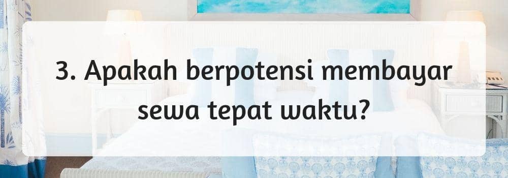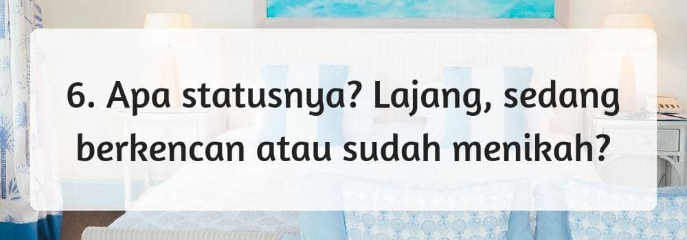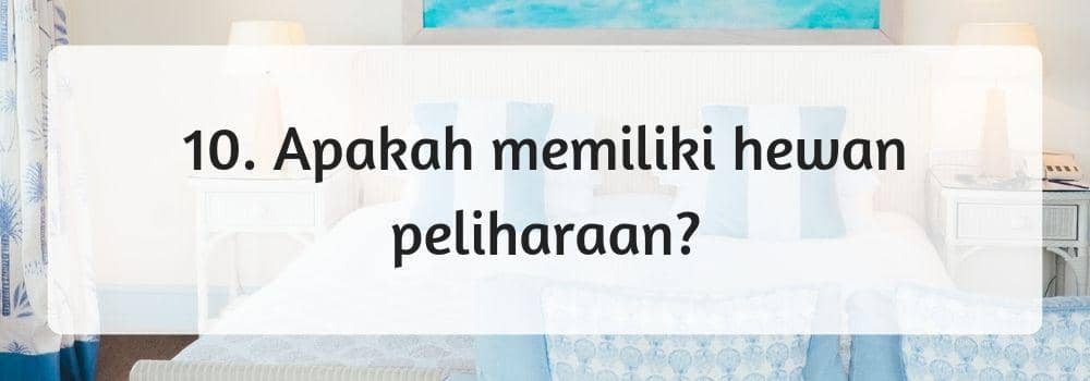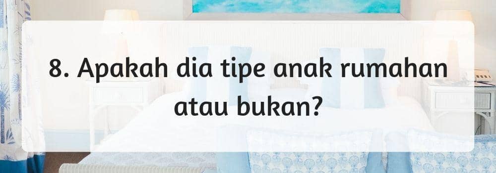 Mengajukan pertanyaan ini penting juga meskipun sebenarnya sangat personal, tetapi tidak ada salahnya untuk memprediksi perilakunya di masa depan. Jika sedang menjalin hubungan apakah ada potensi pasangannya akan berkunjung ke tempat tinggal atau tidak? Kondisi tersebut bisa dibicarakan dan disepakati sejak awal.