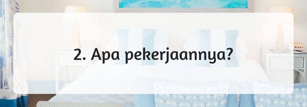 Ketahui apa pekerjaannya, apakah ia bekerja dengan sistem pembagian shift atau di jam kerja pada umumnya. Jam kerja teman sekamarmu juga dapat mempengaruhi pola hidupmu. Misalnya saatnya kamu istirahat rekanmu justru sedang bersiap-siap untuk bekerja, apakah kamu sudah siap dengan situasi seperti itu atau justru lebih nyaman dengan teman yang memiliki jam kerja kurang lebih sama denganmu? Ini menjadi hal yang cukup penting untuk dipertimbangkan.