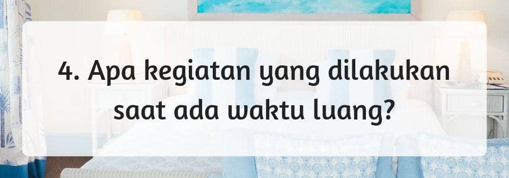 Kamu perlu mengetahui gambaran umum seperti apa hobinya atau saat mengisi waktu luang. Alangkah serunya kalau ternyata dia memiliki hobi dan minat yang sama denganmu atau bisa saling mengisi satu sama lain.