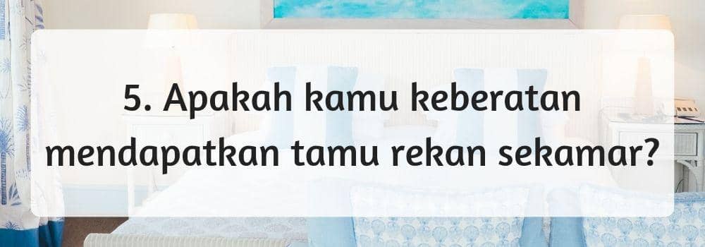Apakah kamu keberatan jika mendapatkan tamu dari rekan sekamarmu? Karena kalau kamu tergolong karakter yang sangat menjunjung tinggi privasi tentu tidak merasa nyaman jika harus bertemu dengan teman-temannya atau orang lain di saat kamu ingin beristirahat. Tetapi di sisi lain kalau kamu ternyata karakter yang gaul dan santai justru ini merupakan momentum untuk menambah teman.