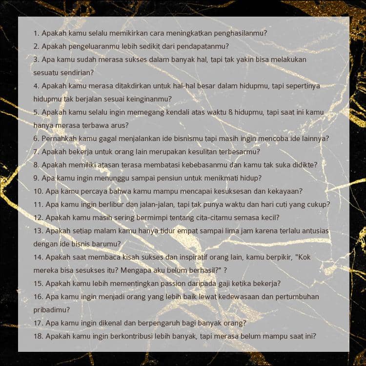 Tapi ia selalu dihantui oleh pertanyaan yang sama, "Apa sih yang memengaruhi dan menentukan kesuksesan seseorang?". Ia pun langsung mewawancara orang-orang sukses dan menemukan kesamaan dari orang-orang tersebut. Nah, coba perhatikan delapan belas pertanyaan berikut ini. Menurut Jaime, kalau kamu menjawab "Ya" pada lebih dari setengahnya, kemungkinan besar kamu akan jadi the next millionaire! Jika pada setiap pertanyaan kamu berhasil menjawab "Ya", bersiap-siaplah untuk jadi miliarder muda!