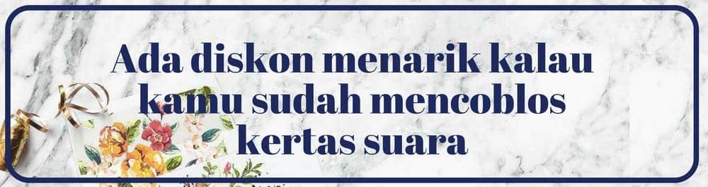 Coba deh cek grup chat kamu, pasti teman-teman kamu sudah rame saling kirim gambar pengumuman sejumlah cafe yang memberi diskon jika jarimu sudah terkena tinta biru. Tapi jangan culas ya, kamu harus jujur kalau kamu memang benar-benar menggunakan hak suaramu karena kamu ingin mendukung kemajuan pemerintahan, bukan malah hanya ingin menikmati diskon.