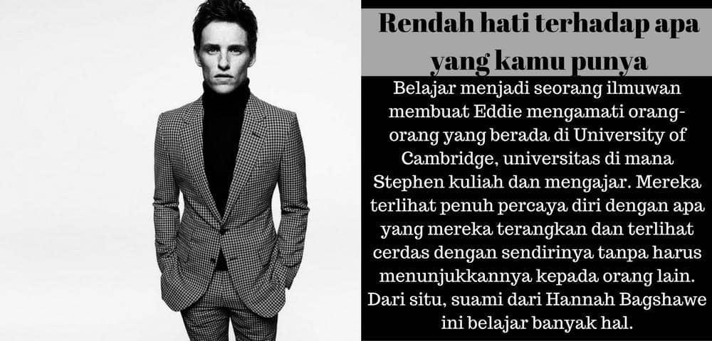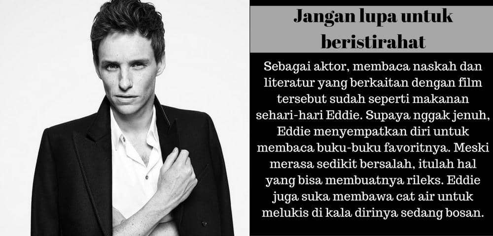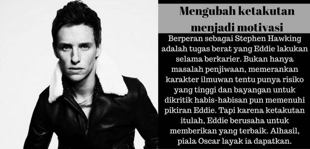 Bela, sudah nonton film Fantastic Beasts and Where to Find Them? Kalau hati kamu kepincut dengan aksi dan akting Eddie Redmayne di film tersebut, sepertinya kamu harus menonton film The Theory of Everything. Dari film itulah, Popbela sadar bahwa aktor berdarah Inggris ini merupakan calon bintang besar di industri perfilman Hollywood. Sukses memerankan Stephen Hawking, ilmuwan legendaris yang menderita penyakit ALS, Eddie dianugerahi penghargaan The Best Actor di ajang Academy Awards. Mungkin dari luar kita memandang bahwa Eddie adalah ‘manusia super’ berkat aktingnya yang brilian. Namun di balik itu semua, Eddie punya ketakutan-ketakutan sepanjang kariernya. Dilansir dari Men’s Health, inilah pelajaran karier yang bisa kamu ambil dari Eddie.