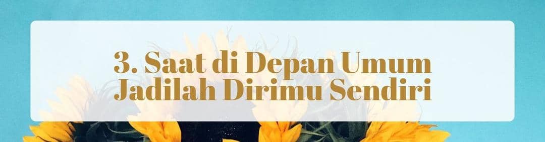 Tampil di depan umum seringkali menjadi momok tersendiri bagi mereka yang merasa kesulitan menghadapinya karena ada beragam sebab. Tetapi kamu pasti mempunyai cara untuk menghadapinya dan mempersiapkan diri supaya mampu meningkatkan rasa percaya dirimu, rahasia lainnya ialah menyakini cukup menjadi dirimu sendiri. Kamu tak perlu berakting demi menarik perhatian orang lain dan atensimu di depan umum. Biarkan kepribadian, minat, bakat dan passion-mu mengantarkanmu untuk bersinar dan dihargai orang lain.