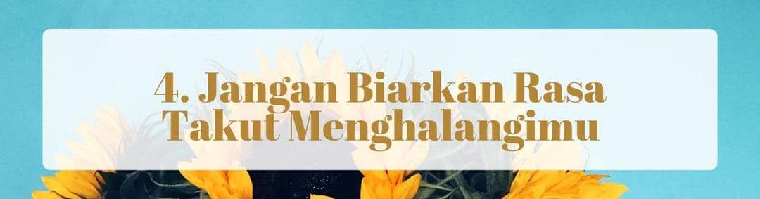 Jangan biarkan rasa takut datang dan menguasai kehidupan kita sehari-hari, karena terkadang dalam perjalanan hidup kita tidak selalu menghadapi situasi yang sama,  kita harus siap menghadapi perubahan demi perubahan untuk mencapai kesuksesan di masa mendatang. Misalnya saja ketika kamu siap menapak pengalaman baru dan mengambil risiko untuk meninggalkan pekerjaan tetap demi mengejar impianmu sendiri atau jangan sampai terperosok dalam zona nyaman ketika ingin berganti pekerjaan baru, ingatlah kita harus senantiasa bersemangat untuk  maju. Jika kamu membiarkan rasa takut terus menguasai kehidupan maka tidak ada jalan untuk keluar dari zona nyaman, berilah dirimu waktu dan kesempatan untuk terus maju mencapai impianmu.