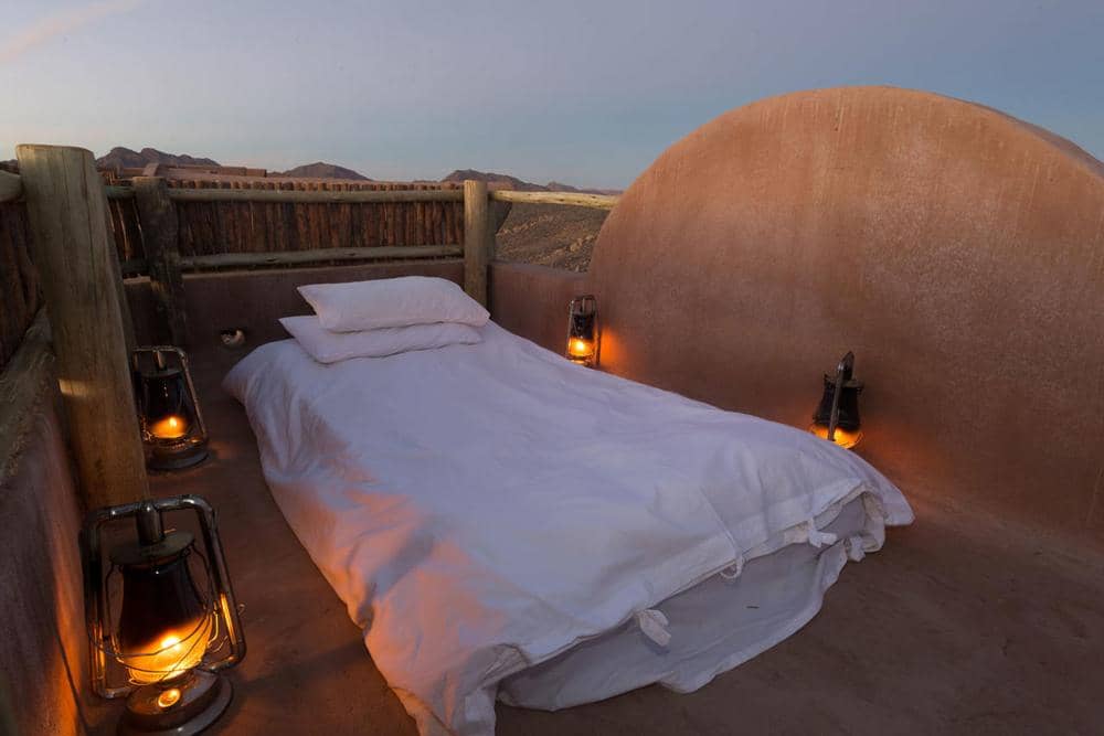 Penginapan ini terletak di tengah-tengah padang pasir Kulala Wilderness Reserve seluas 27.000 hektar ini. Kamu bisa menikmati sensasi tidur beratap kolong langit serta suara-suara desiran pasir khas Africa.