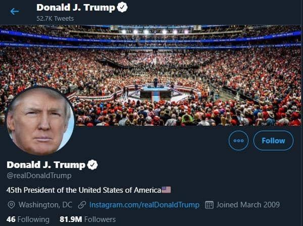 Presiden Amerika Serikat Donald Trump menjadi kepala negara dengan jumlah follower Twitter terbanyak. Ia memiliki 112,1 juta pengikut. Jumlah followers tersebut merupakan akumulasi dua akun yang dimilikinya yakni @realDonaldTrump dan @POTUS.