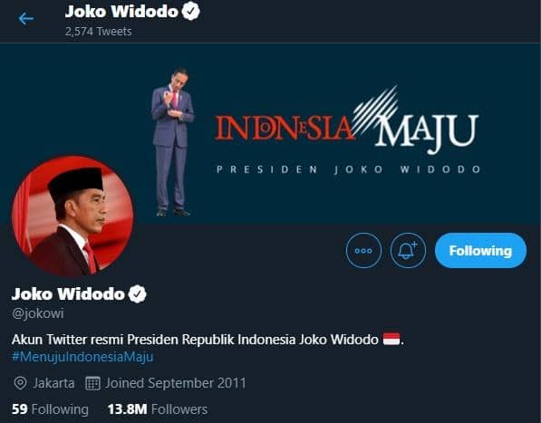 Hanya memiliki satu akun Twitter, Presiden Indonesia Joko Widodo mempunyai sekitar 13,8 juta pengikut di Twitter. Melalui akun Twitter-nya, Presiden Jokowi sering membagikan kegiatannya, perkembangan kebijakan negara, ucapan bela sungkawa kepada tokoh yang meninggal dunia, dan opininya terhadap isu publik.
