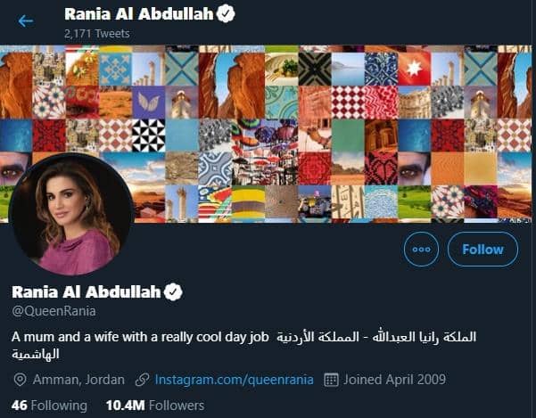 Ratu Rania Al Abdullah dari Yordania merupakan satu-satunya pemimpin dunia perempuan dengan jumlah pengikut Twitter terbanyak, yakni 10,4 juta. Meskipun jarang membuat unggahan di Twitter, namun Ratu Rania selalu berisikan kutipan inspiratif.