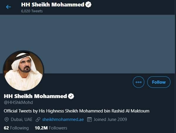 Terakhir, ada Wakil Presiden Uni Emirat Arab Sheikh Mohammed bin Rashid Al Maktoum yang memiliki jumlah pengikut sebanyak 10,2 juta. Lewat Twitternya, Sheikh Mohammed membagikan kegiatan kenegaraannya dan situasi terkini di Uni Emirat Arab.