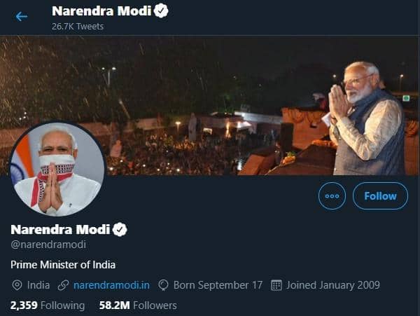 Sama seperti Donald Trump, Perdana Menteri India Narendra Modi juga memiliki dua akun untuk berinteraksi dengan warganya. Akumulasi dari dua akun yang dikelolanya, jumlah pengikut yang dimilikinya mencapai 94 juta.